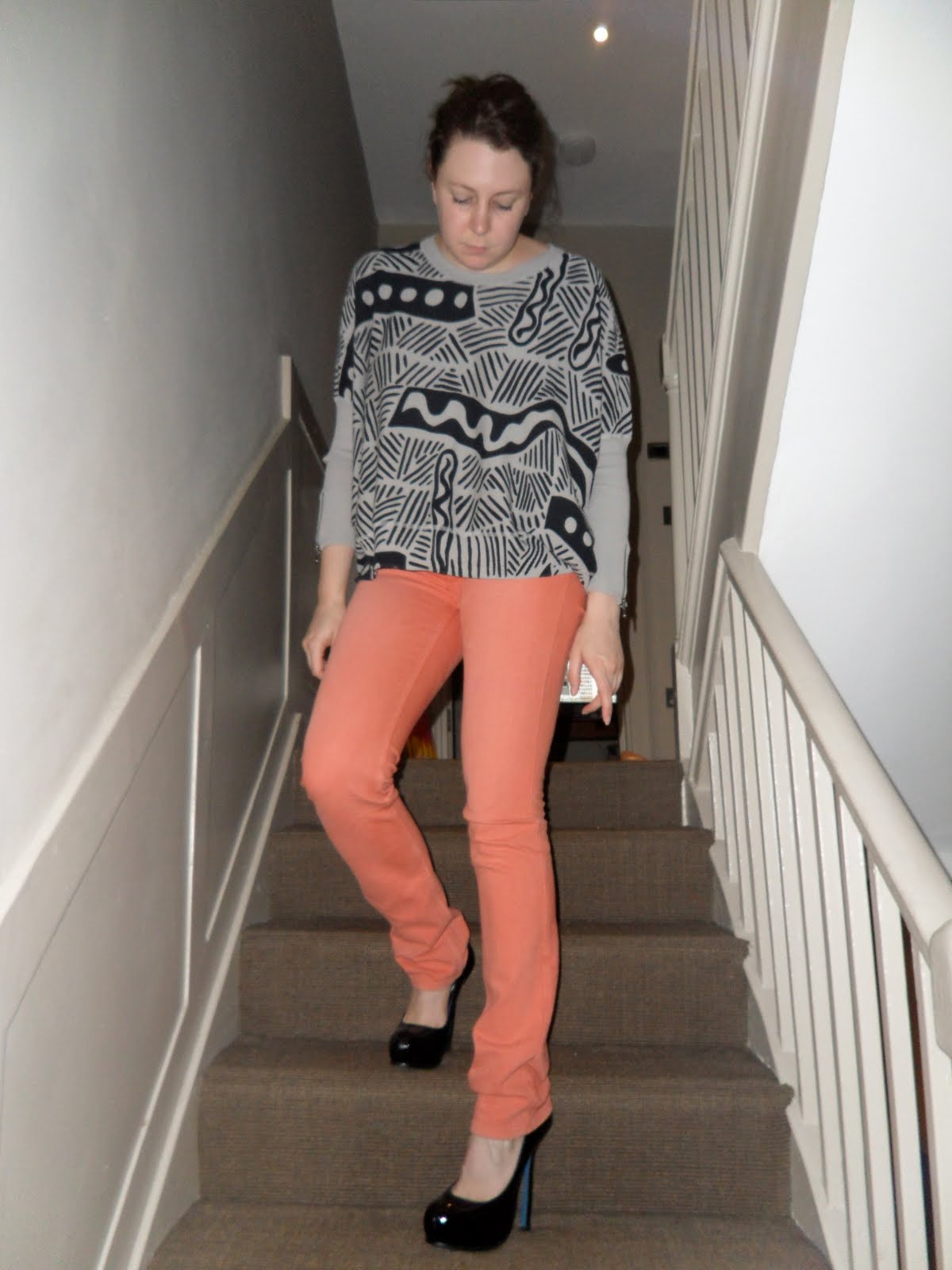 I don't buy expensive jeans. Ever. A couple of years ago I had a mad time in Uniqlo, and often bought two or three pairs in different colour ways every time I went in. As a result I must have 20 - 30 pairs of Uniqlo skinnies in every colour under the rainbow. They are normally only £25 maximum, and if you wait for an offer you can frequently pick up two pairs for £30, then you can wear 'em, cut 'em, bleach 'em or customise them without the worry of ruining something super pricey. But when they're a lovely coral, why not let the colour do the talking?